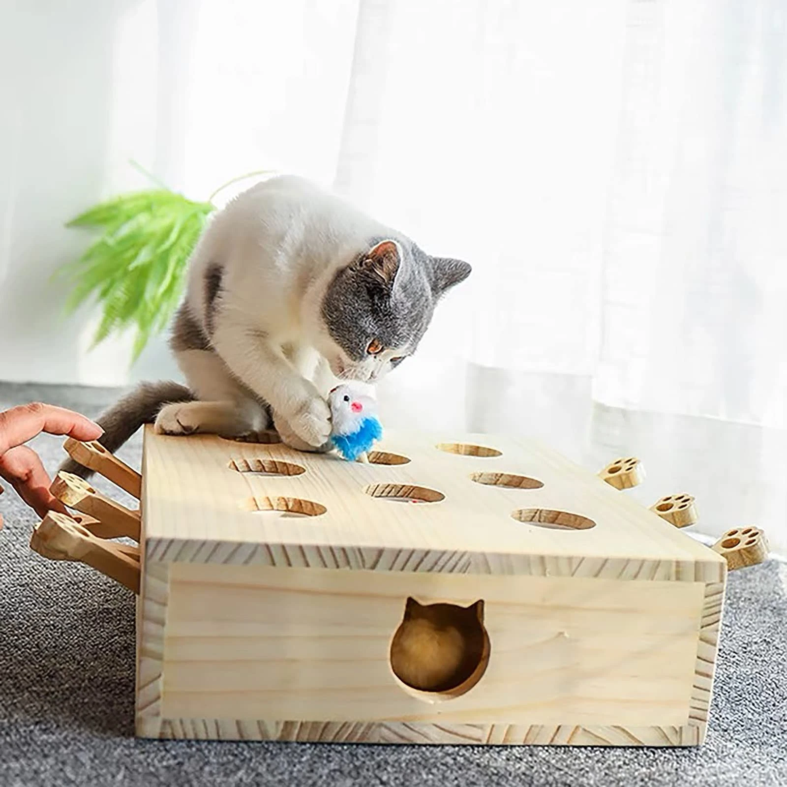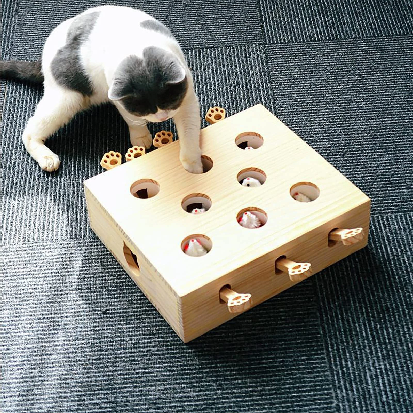 Keep your pets entertained and active with this fun and safe Whack-A-Mole interactive toy. Made of natural solid wood with colorful plush moles, it stimulates your cat’s hunting instincts while promoting exercise and bonding between pets and owners.
